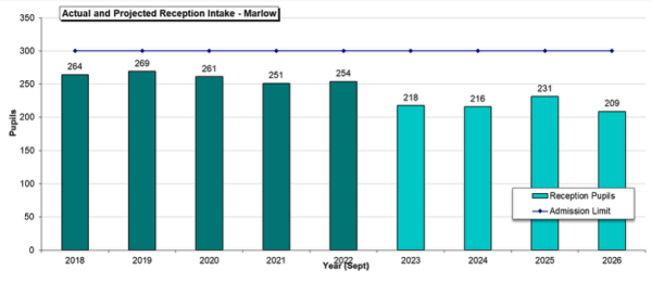- The number of children reaching Reception age in Marlow is projected to continue to decline. As the table below highlights, in 2019 there were nearly 270 children to fill the 300 Reception places in the town. This number has fallen to 231 children in 2025, and is due to drop further to 209 children in September 2026. This is a drop of nearly 25% in a relatively short space of time.