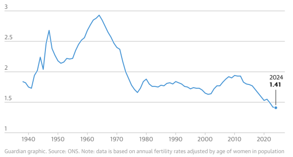 - This is also a national trend. Just last month, the Office of National Statistics reported that fertility rates in 2024 fell to a record low with the average fertility rate being 1.41 children per female. This is the lowest rate since records began in 1938.